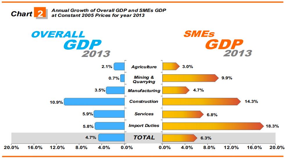 In 2013, the growth of SMEs GDP strengthened to 6.3 per cent as compared to the growth of Overall GDP at 4.7 per cent as shown in Chart 2. The growth of SMEs GDP was supported by positive momentum across all sectors with Services, Manufacturing and Construction being the major contributors. These sectors accounted for 88.8 per cent to total SMEs GDP.