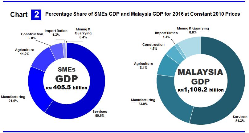 SMEs GDP share of Services sector expanded further 40.2 per cent as compared to 39.9 per cent in 2015. The contribution was dominated by Finance, Insurance, Real Estate and Business Services sub-sector impelled by Business Services segment. Furthermore, Wholesale & Retail Trade, Food & Beverages and Accommodation sub-sector also supported this sector particularly in Retail and Motor Vehicles segments.