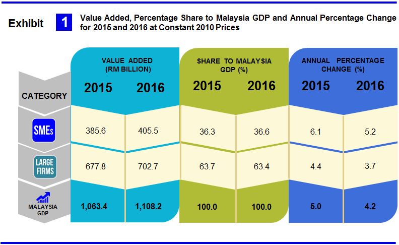 The performance of SMEs GDP outpaced the Malaysia GDP in 2016 with a growth of 5.2 per cent compared to Malaysia GDP which stood at 4.2 per cent as shown in Exhibit 1. This reflects the importance of SMEs in gearing up the nation’s economy. The contribution of SMEs GDP to the Malaysia GDP has increased steadily to 36.6 per cent from 36.3 per cent recorded in preceding year.
