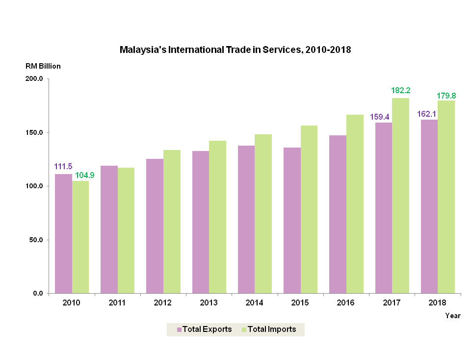 In 2018, Malaysia recorded RM162.1 billion in export of services as compared to RM159.4 billion in the previous year, mainly contributed by tourism under travel, other business services and transport. Meanwhile, import of services registered RM179.8 billion, reduced from RM182.2 billion in 2017, mainly due to the lower payments for construction and transport. The exports grew by 1.7 per cent while imports were down by 1.3 per cent, narrowed the services deficit to RM17.7 billion from RM22.9 billion in the preceding year. The total trade in services was RM341.9 billion, which represents 23.6 per cent of Gross Domestic Product (GDP at current prices) in 2018.