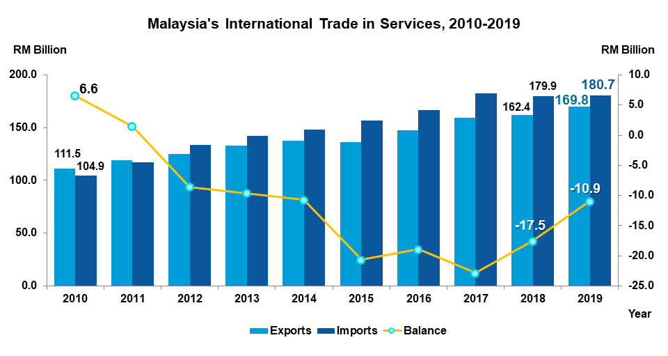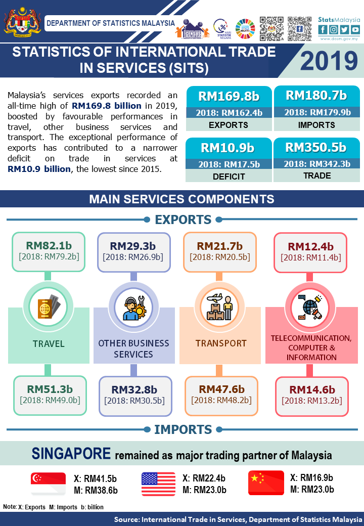 Malaysia’s services exports reached an all-time high by recording RM169.8 billion in 2019, boosted by favourable performance in travel, air transport and professional services. Meanwhile, imports increased marginally from RM179.9 billion to RM180.7 billion in 2019 led by the outbound activities and other business services. The exceptional performance of exports and lower imports of construction activities have contributed to a narrower trade deficit in services to RM10.9 billion as against RM17.5 billion in 2018, the lowest since 2015. Malaysia’s total trade in services increased to RM350.5 billion, grew by 2.4 per cent as against RM342.3 billion in 2018. Total trade in services made up 23.2 per cent of Gross Domestic Product (GDP at current prices) for 2019.