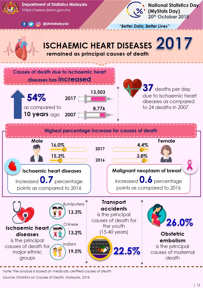 Ischaemic heart diseases recorded the highest percentage of 16.0 per cent, followed by Pneumonia (11.8%), Transport accidents (6.5%), Cerebrovascular diseases (6.4%) and Malignant neoplasm of trachea, bronchus & lung (2.7%).