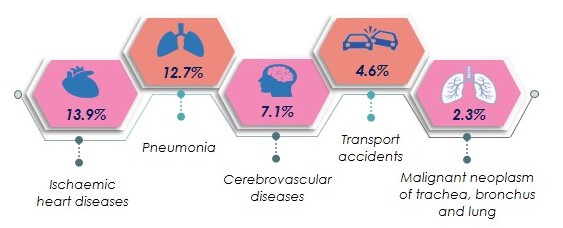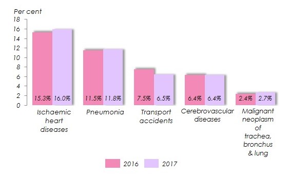 In 2017, the per cent of deaths caused by Ischaemic heart diseases was 13.9 per cent, followed by Pneumonia (12.7%), Cerebrovascular diseases (7.1%), Transport accidents (4.6%) and Malignant neoplasm of trachea, bronchus and lung (2.3%).