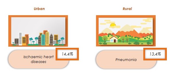 The principal causes of death in urban areas was Ischaemic heart diseases (14.4%) while Pneumonia (13.4%) was the principal causes of death in rural areas.