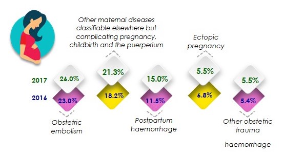 Obstetric embolism was the main principal causes of death for maternal death. In 2017, the percentage of deaths caused by Obstetric embolism were 26.0 per cent.
