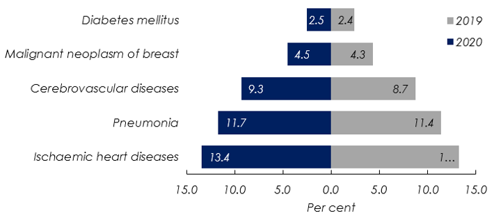 Ischaemic heart diseases become the principal causes of death for females at 13.4 per cent of the 43,237 medically certified deaths in 2020. This was followed by Pneumonia (11.7%), Cerebrovascular diseases (9.3%), Malignant neoplasm of breast (4.5%) and Diabetes mellitus (2.5%). Previously, Pneumonia was the principal causes of death for females.