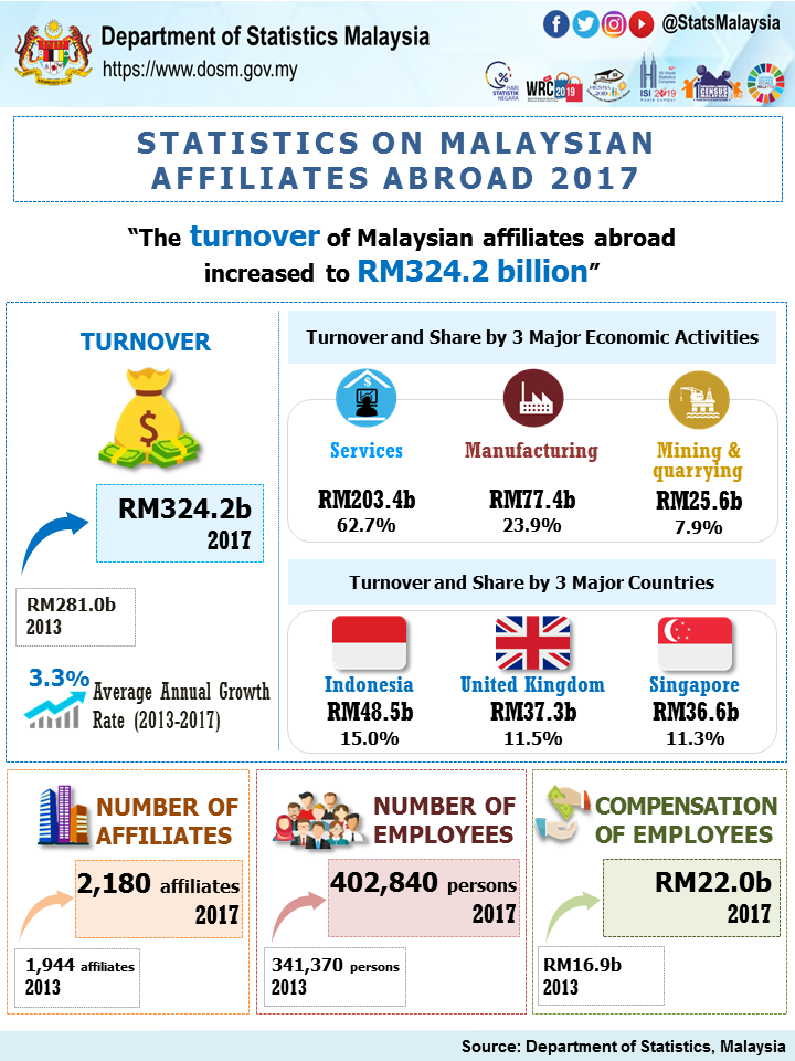 In 2017, Malaysian affiliates abroad generated a turnover of RM324.2 billion as compared to RM281.0 billion in 2013 with an average annual increase of 3.3 per cent over the five years period. There were 2,180 number of Malaysian affiliates abroad as at 2017.