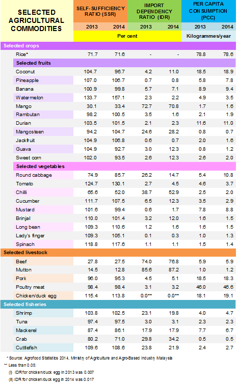 In 2014, SSR for rice was 71.6 per cent as compared to 71.7 per cent in 2013. Selected fruits of pineapple, watermelon, rambutan, durian, mangosteen and jackfruit recorded SSR above 100 per cent. Meanwhile, selected vegetables that recorded SSR above 100 per cent were tomato, cucumber, brinjal, long bean, lady’s finger and spinach. For selected livestock, only chicken/duck egg recorded SSR above 100 per cent and two selected fisheries namely shrimp and cuttlefish also recorded SSR above 100 per cent.