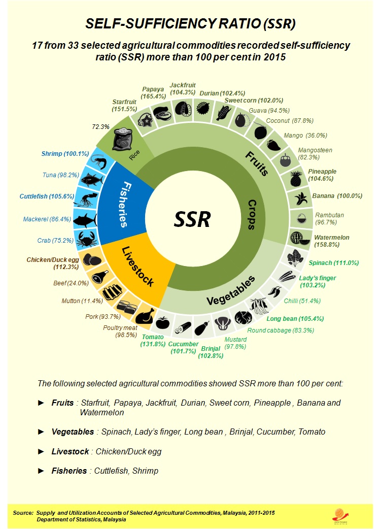 Selected agricultural commodities are divided into three categories namely selected crops, (fruits and vegetables), selected livestock and selected fisheries. In 2015, a total of 33 commodities were covered and 17 of them recorded self-sufficiency ratio (SSR) more than 100 per cent.