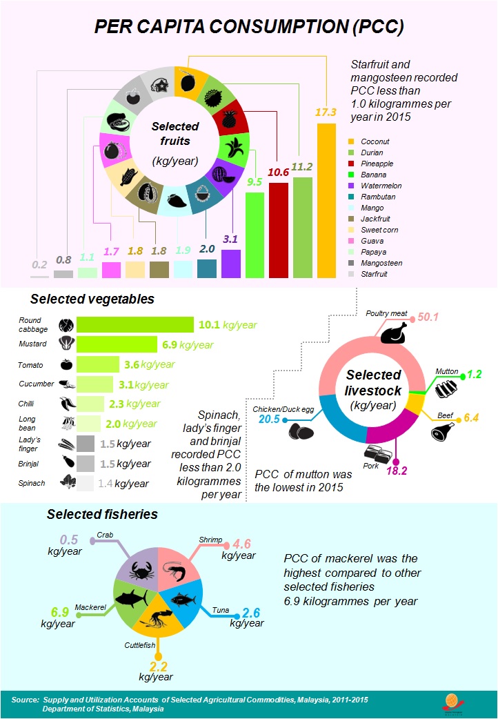Eight of the thirteen selected fruits recorded SSR more than 100 per cent. Papaya recorded the highest SSR of 165.4 per cent followed by watermelon (158.8%) and starfruit (151.5%). Per capita consumption (PCC) of coconut was the highest (17.3 kilogrammes per year) followed by durian (11.2 kilogrammes per year) and pineapple (10.6 kilogrammes per year).