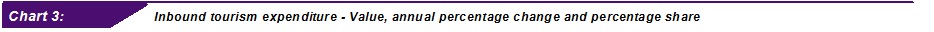 Inbound tourism expenditure increased to RM80.1 billion (2013: RM73.4 billion) and registered a growth of 9.1 per cent (Chart 3). The higher visitor’s receipts mirrored the growth of inbound tourist arrivals which increased to 6.7 per cent in 2014 reaching 27.4 million arrivals. From the inbound tourism expenditure, tourist receipts constituted 97.6 per cent.