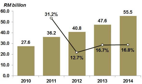Domestic tourism expenditure continued to register a double-digit growth of 16.8 per cent in 2014 (2013: 16.7%). This performance was propelled by the impressive growth recorded by shopping and retail sale of automotive fuel. In terms of share, shopping remained as the largest component of domestic tourism expenditure and accounted for 36.9 per cent (Chart 4).