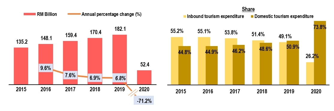 Internal tourism consumption comprises inbound tourism expenditure and domestic tourism expenditure. A total of RM52.4 billion of internal tourism consumption was generated in 2020 (2019: RM182.1 billion). The disruption in demand caused overall internal tourism consumption in 2020 to decline by 71.2 per cent compared to a growth of 6.8 per cent in the previous year. Inbound tourism expenditure was hit hard by recording a plunge of 84.6 per cent while domestic tourism experienced a drop of 58.3 per cent.