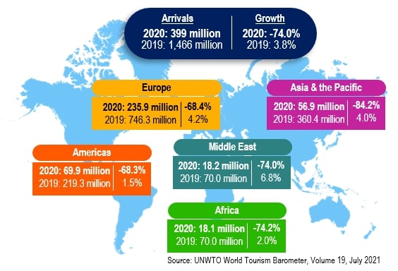 The world faced an unprecedented health, social and economic emergency as a result of the COVID-19 outbreak. Tourism was among the most affected sector due to disruptions in demand as a result of travel restrictions and the closure of the international borders by most countries. Based on the UNWTO World Tourism Barometer, the number of tourist arrivals worldwide recorded in 2020 was 399 million people compared to 1.47 billion people in 2019. The reduction of more than 1 billion tourists registered a decrease of 74.0 per cent (Exhibit 1). This situation is similar to the record number of tourist arrivals in the last 30 years. |