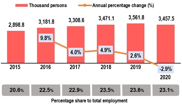 The tourism industry in 2020 marked 3.5 million employed person and has contributed 23.1 per cent to the total employment in Malaysia. The employment growth of this industry has contracted by 2.9 per cent (Exhibit 4). |