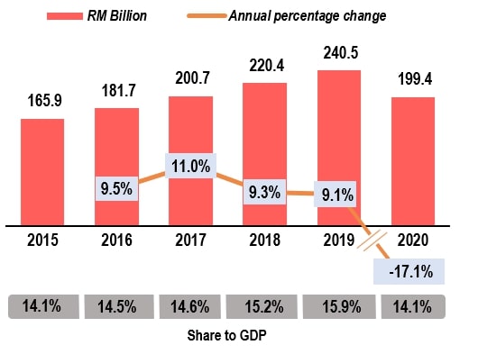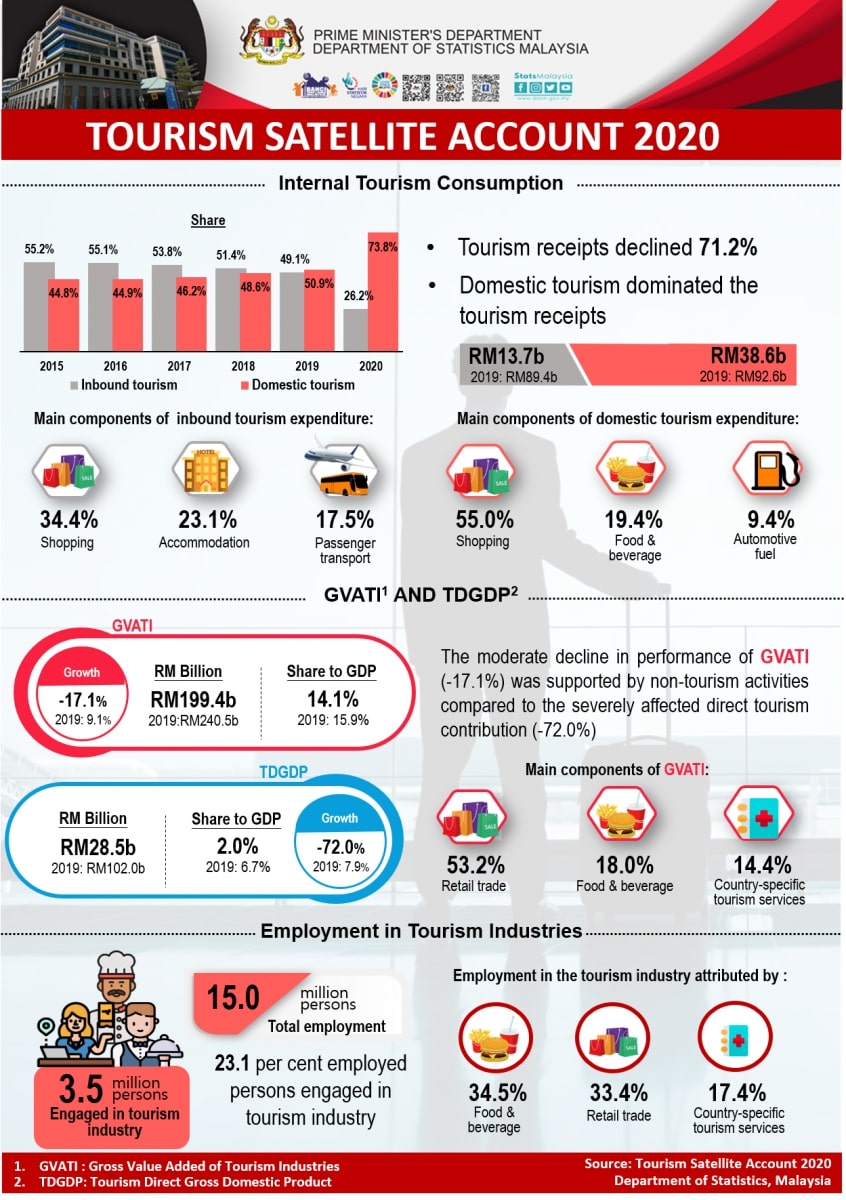 Tourism receipts registered a fall of 71.2 per cent recording RM52.4 billion in 2020