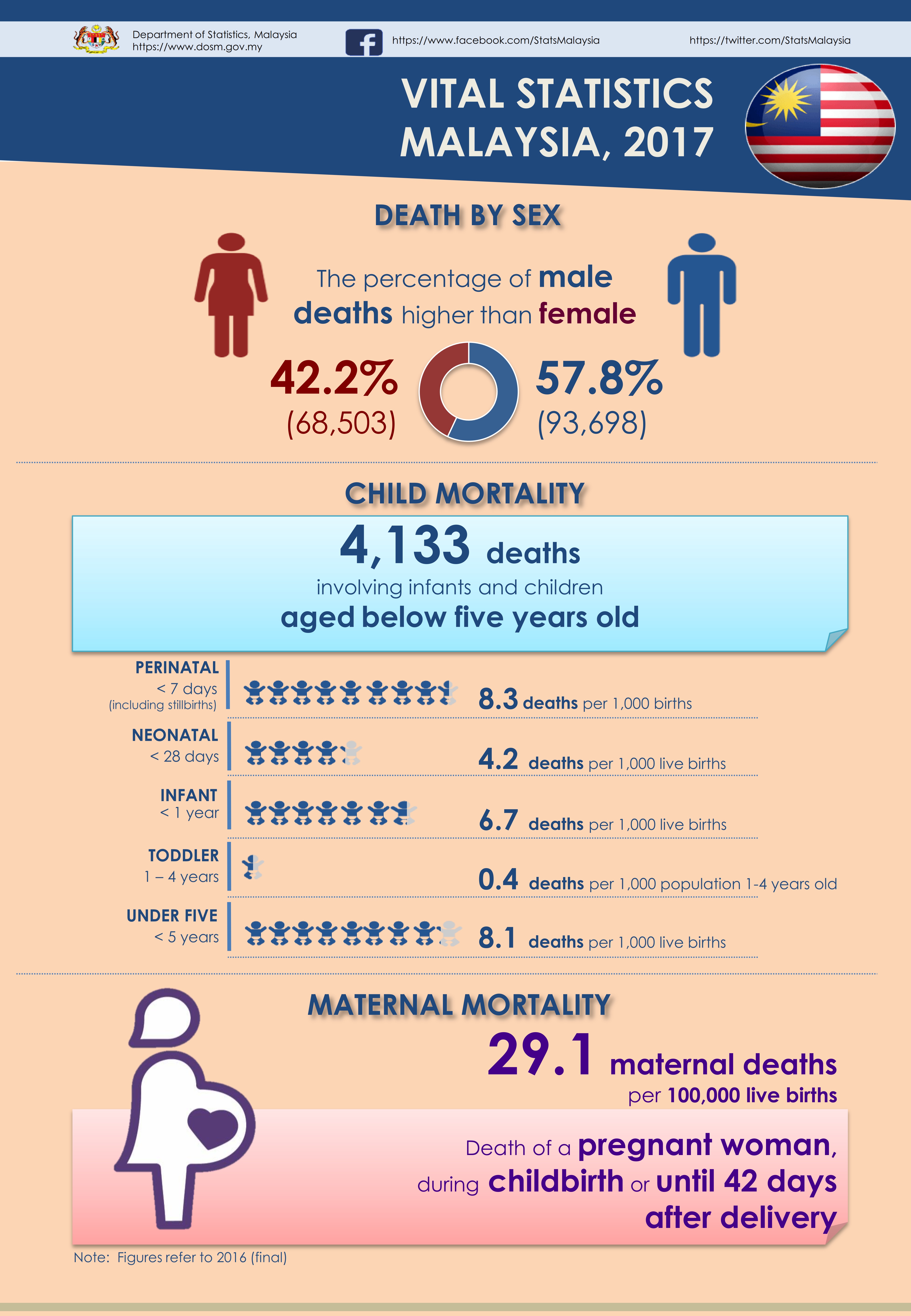 Kuala Penyu district in Sabah recorded the highest crude death rate in 2016 with 9.8 per 1,000 population followed by Julau, Sarawak (9.2) and Pendang, Kedah (8.8). Meanwhile, Kinabatangan district in Sabah recorded the lowest crude death rate with 0.8 per 1,000 population followed by Belaga, Sarawak (2.1) and Kunak, Sabah (2.2).
