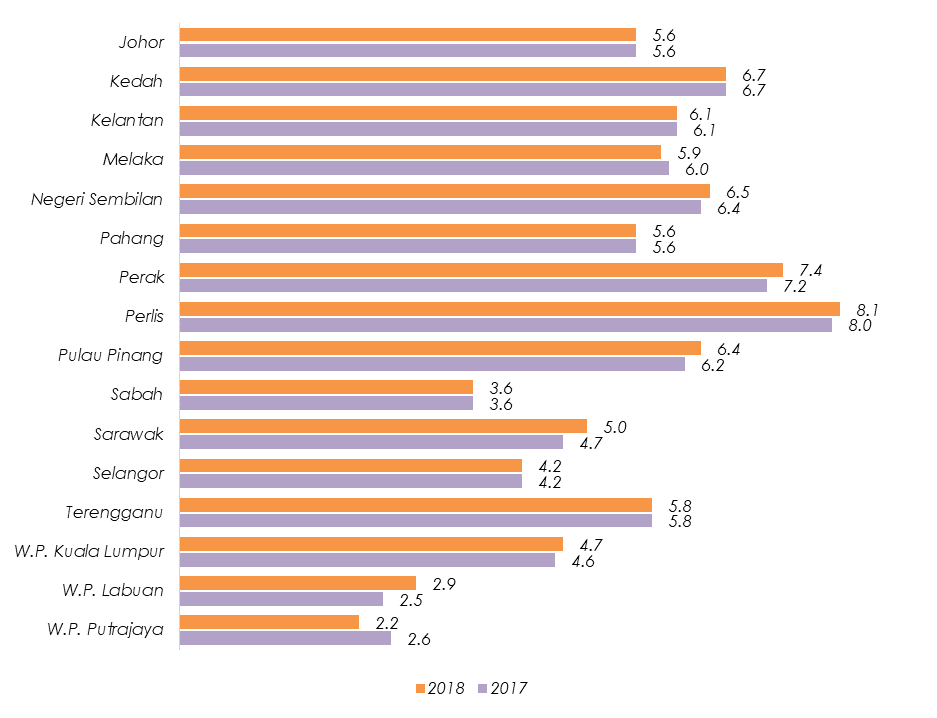 Perlis recorded the highest CDR of 8.1 per 1,000 population whilst W.P. Putrajaya recorded the lowest rate of 2.2 in 2018.