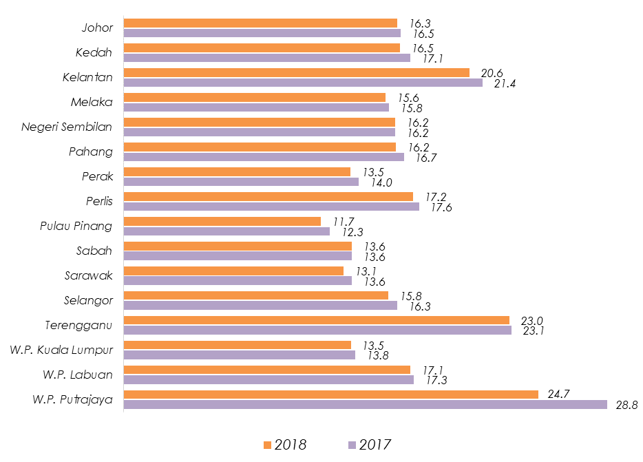 Chart 1: Crude birth rate by state, Malaysia, 2017 and 2018