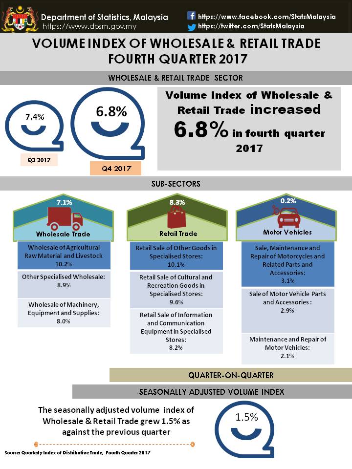 In fourth quarter 2017, the Retail Trade sub-sector registered a growth of 8.3 per cent to 163.9 points year-on-year. The growth was contributed by Retail Sale of Other Goods in Specialised Stores (10.1%), Retail Sale of Cultural and Recreation Goods in Specialised Stores (9.6%) and Retail Sale of Information and Communication Equipment in Specialised Store ( 8.2%).