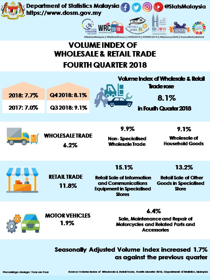 In 2018, volume index of Wholesale & Retail Trade recorded a growth of 7.7 per cent to 168.9 points. On the fourth quarter, it expanded 8.1 per cent to 173.8 points as compared to the same period in 2017. The growth was driven by Retail Trade with 11.8 per cent.