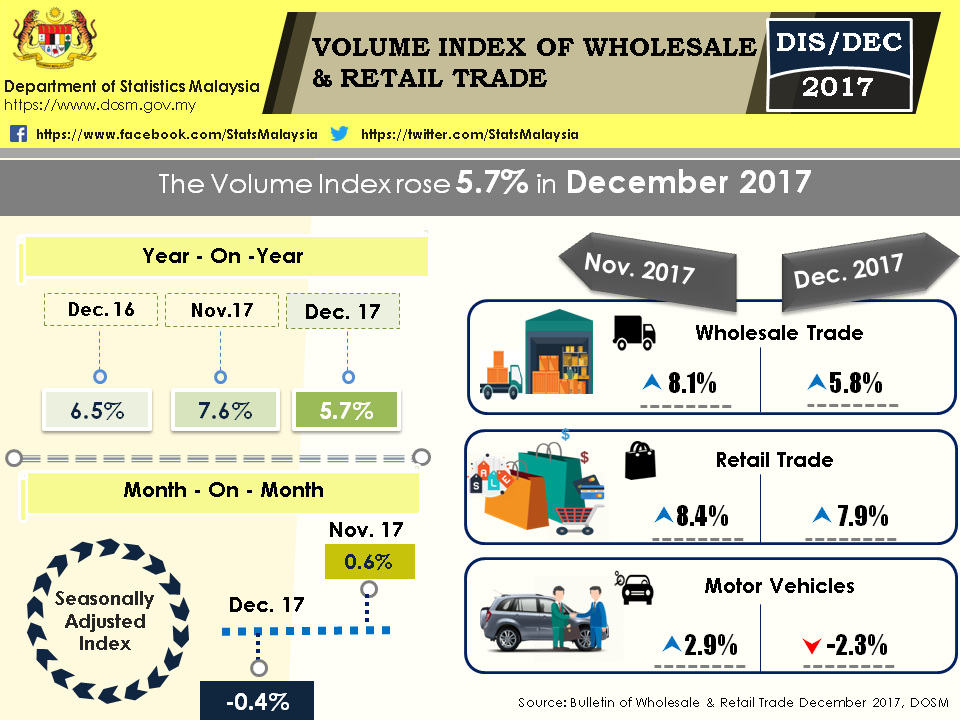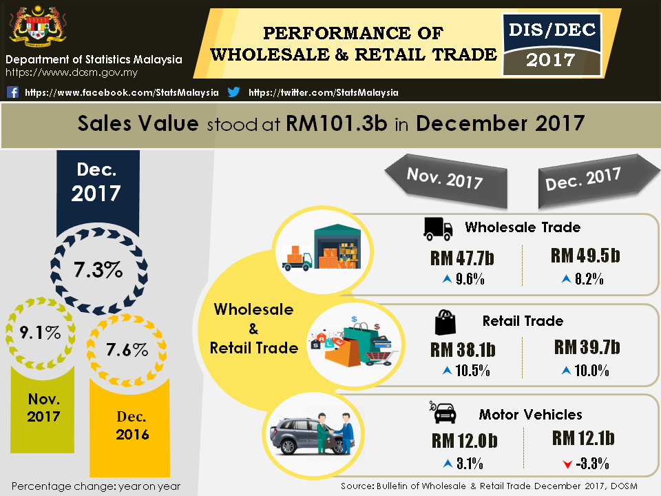 Sales value of Wholesale & Retail Trade stood at RM101.3 billion (7.3%) in December 2017 as compared to the corresponding period in 2016. The sales value consists of Wholesale Trade (RM49.5 billion), Retail Trade (RM39.7 billion) and Motor Vehicles (RM12.1 billion) businesses. The positive growth was contributed by Retail Trade (10.0%) and Wholesale Trade (8.2%) businesses.