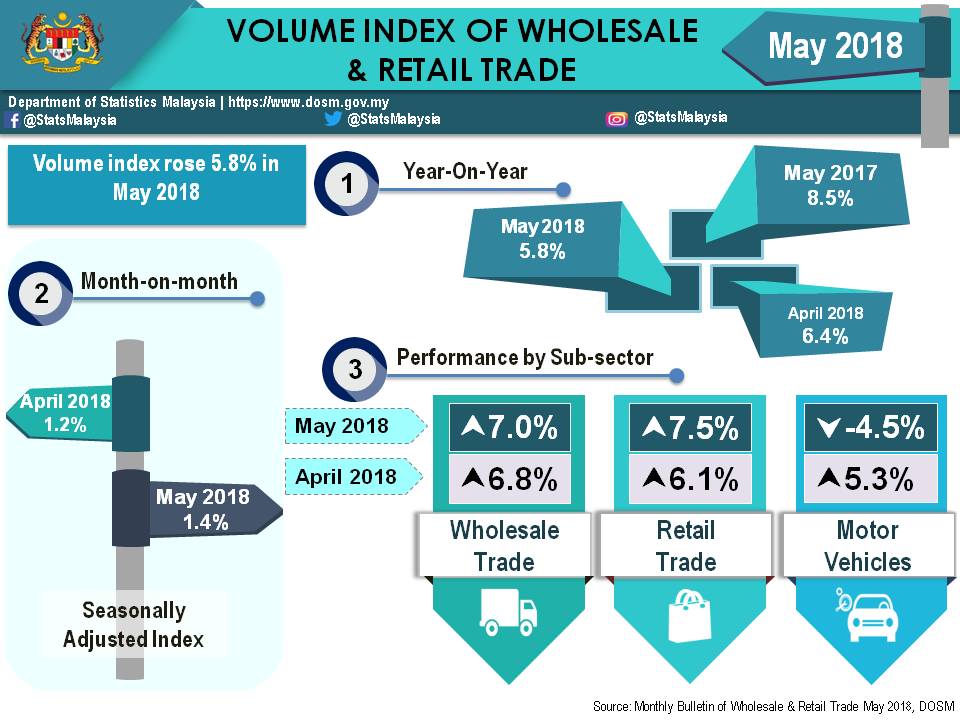 Volume index of Wholesale & Retail Trade continue to grow, recorded 5.8 per cent to 166.1 points in May 2018 as compared to May 2017. The gain was supported by expansion in both Retail Trade (7.5%) and Wholesale Trade (7.0%). Within the same month, seasonally adjusted volume index of Wholesale & Retail Trade increased 1.4 per cent over the preceding month.