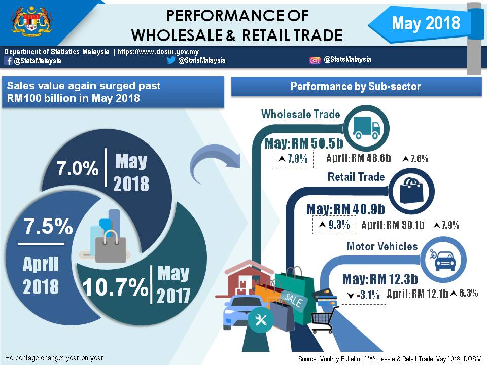 Once again, the sales value of Wholesale & Retail Trade exceeded RM100 billion for the third times to record RM103.7 billion in May 2018 (January 2018: RM101.1 billion; March 2018: RM103.8 billion). In terms of growth, the sales value increased 7.0 per cent as compared to the corresponding period in 2017, driven by Retail Trade ( 9.3%) and Wholesale Trade ( 7.8%).