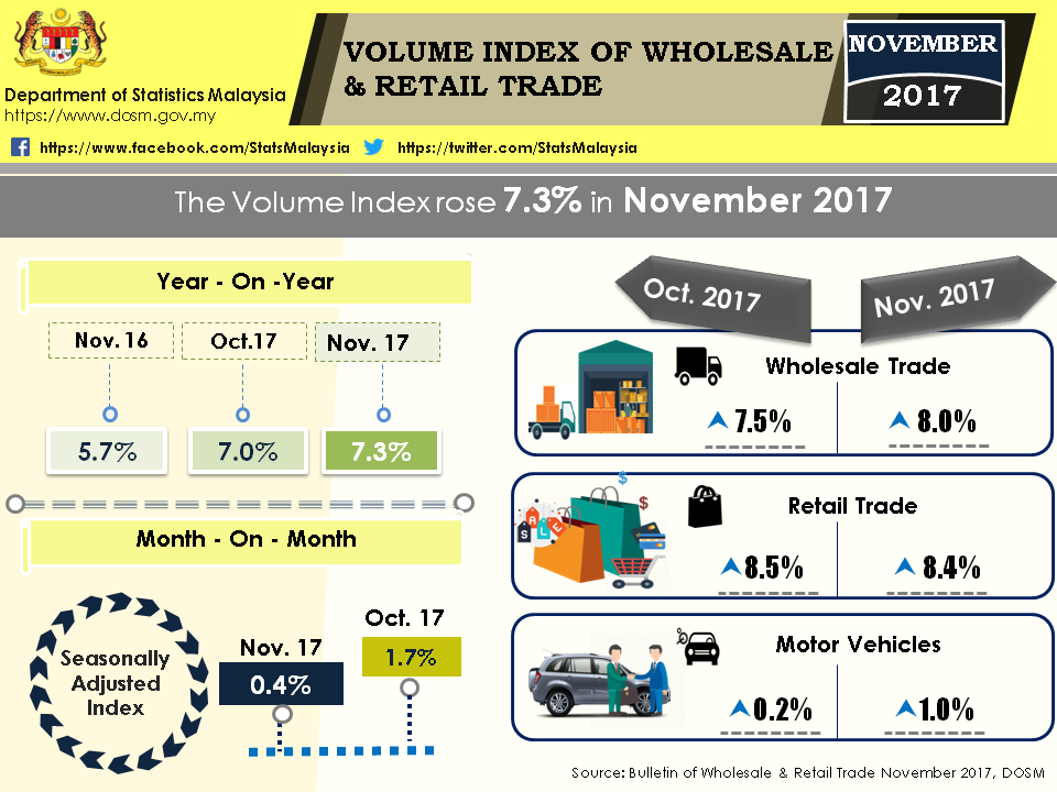 Sales value of Wholesale & Retail Trade stood at RM97.7 billion (9.0%) in November 2017 as compared to the corresponding period in 2016. The sales value consists of Wholesale Trade (RM47.7 billion), Retail Trade (RM38.1 billion) and Motor Vehicles (RM12.0 billion) businesses. The positive growth was contributed by Retail Trade (10.5%) and Wholesale Trade (9.6%) businesses.