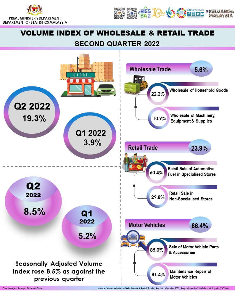 The full publication of the Quarterly Volume Index of Wholesale & Retail Trade, Second Quarter 2022 can be downloaded through eStatistik Portal.