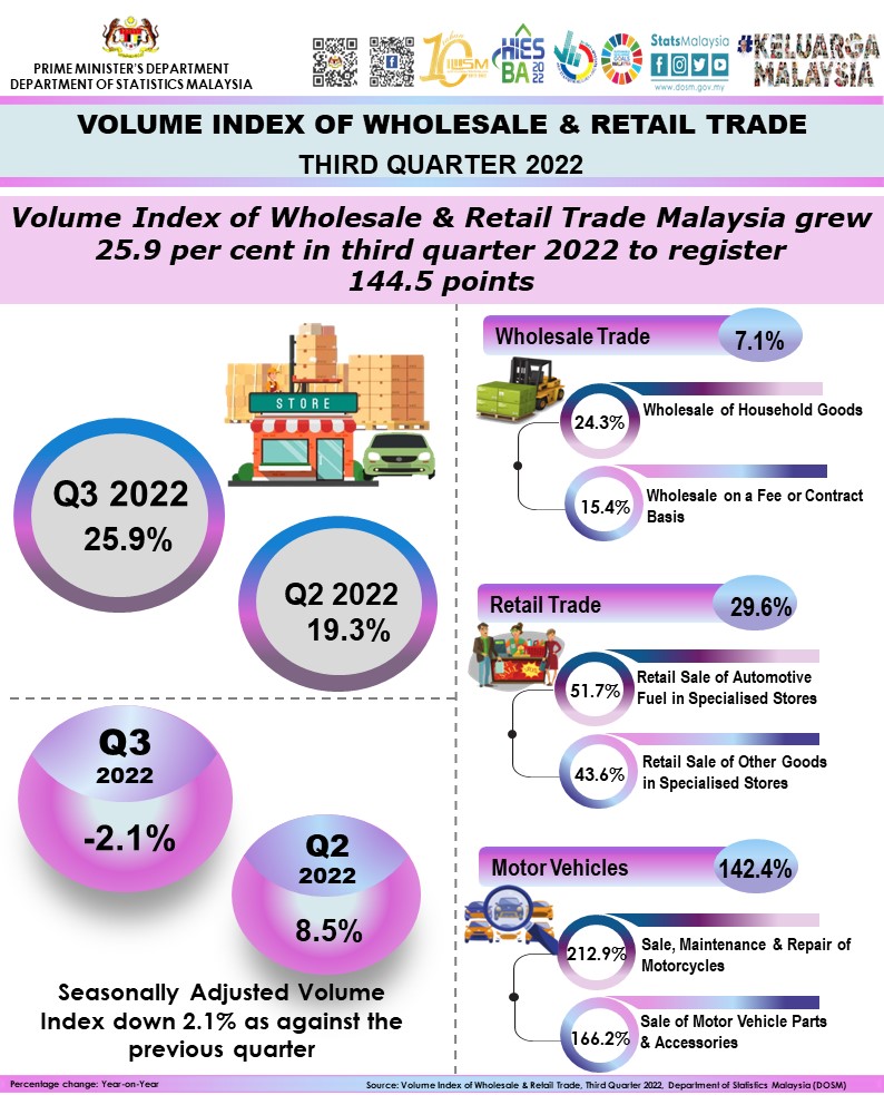 The full publication of the Quarterly Volume Index of Wholesale & Retail Trade, Third Quarter 2022 can be downloaded through eStatistik Portal.