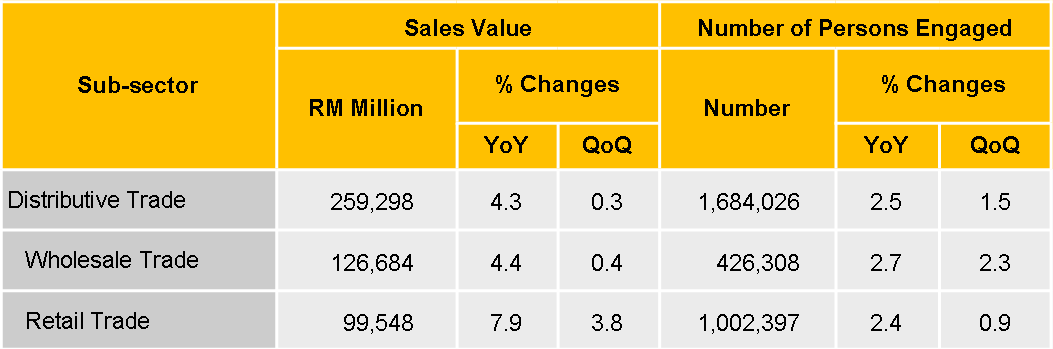 Retail Trade sub-sector recorded an increase in sales value of RM7.3 billion or 7.9 per cent as compared to the corresponding quarter of the previous year. On a quarterly basis, sales value of this sub-sector increased by 3.8 per cent.